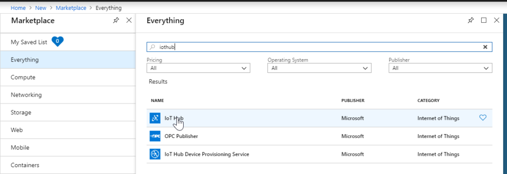 W tym kroku należy zalogować się do konsoli Azure i kliknąć „Create a resource” i wyszukać „io hub”, i oczywiście wybrać go z listy propozycji.