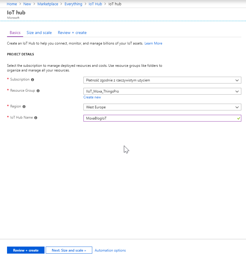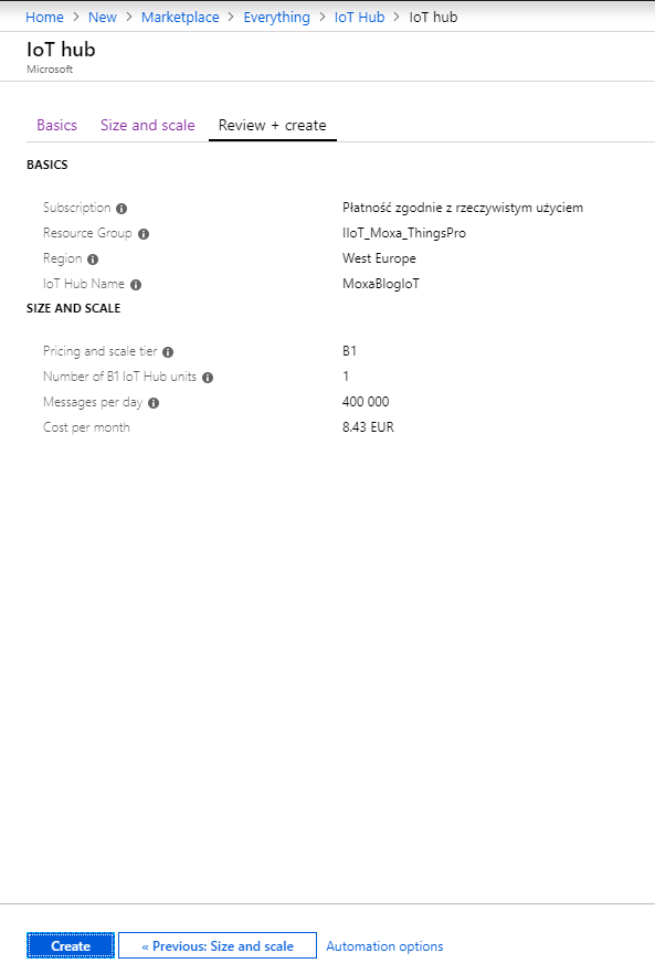 Następnie zobaczysz krótki opis usługi i przydatne linki, wystarczy kliknąć „Create”. W następnym widoku należy wybrać subskrypcję, grupę zasobów (można też utworzyć nową), region i nazwę huba IoT.