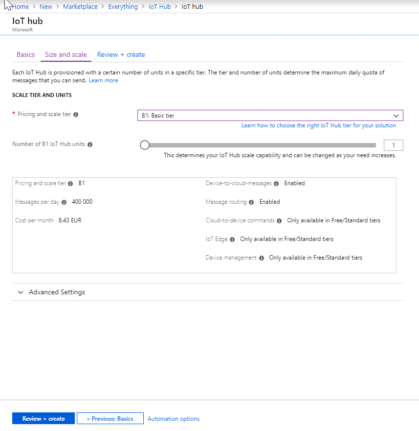 W następnym widoku wybieramy rozmiar i skalę naszego huba, oczywiście im wyższe limity tym zasób będzie droższy. Na początek najprościej i najtaniej jest wybrać „Free tier”.