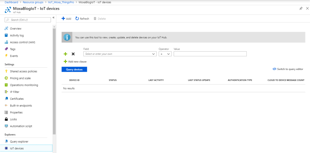 Na rynku dostępnych jest wielu dostawców rozwiązań chmurowych, dlatego postanowiłem napisać kolejny wpis z tej serii, tym razem na podstawie chmurę Microsoftu. Porównując możliwości różnych dostawców wyraźnie widać że usługi i możliwości są bardzo podobne, często identyczne, więc wybierając dostawcę warto wziąć pod uwagę różne aspekty, i porównać możliwości. W Azure, czyli platformie chmurowej Microsoftu, znajdziemy odpowiednik AWS IoT Core, a konkretnie IoT Hub. Posiada on bardzo podobną funkcjonalność, i umożliwia zarówno odbieranie wiadomości od urządzeń, jak i wysyłanie do nich danych. We wpisie tym pokażę na podstawie przygotowanej przykładowej topologii jak skonfigurować ThingsPro Gateway zainstalowanego na UC-8112-ME-LX do odczytywania urządzeń Modbus TCP, i wysyłania danych do chmury, a także konfigurację wszystkich niezbędnych składników w konsoli web Azure, zapraszam do lektury.
