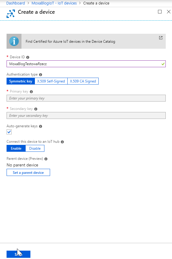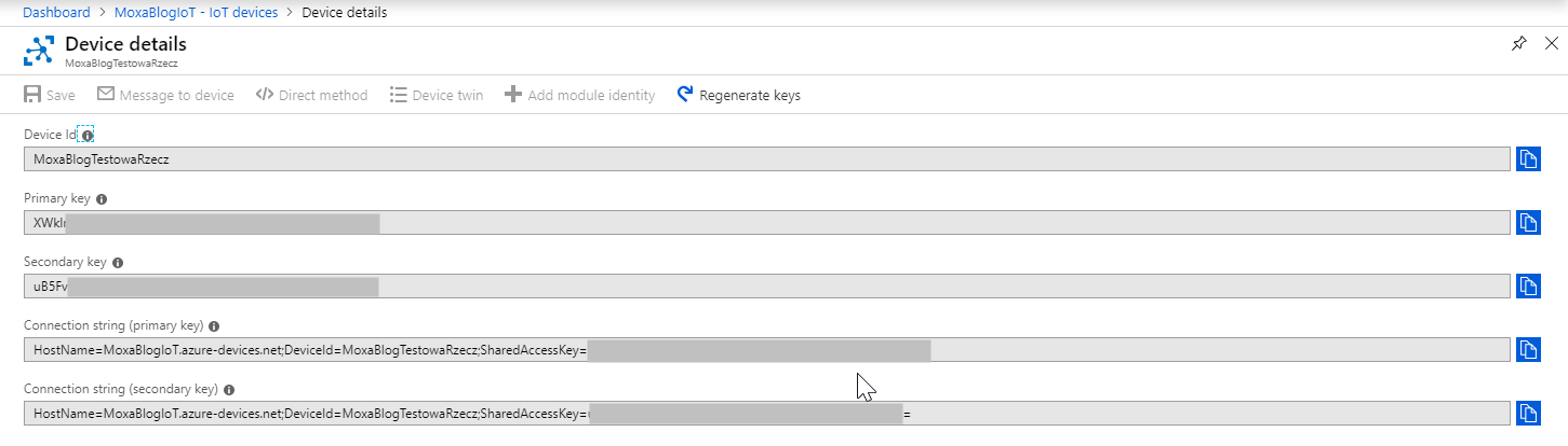 Następnym krokiem jest utworzenie „IoT device” czyli naszej rzeczy, wystarczy kliknąć "IoT devices" i "Add". Po jej dodaniu pojawi się na liście, należy w nią kliknąć i zapisać parametr „Connection string (primary key)” na dysku.