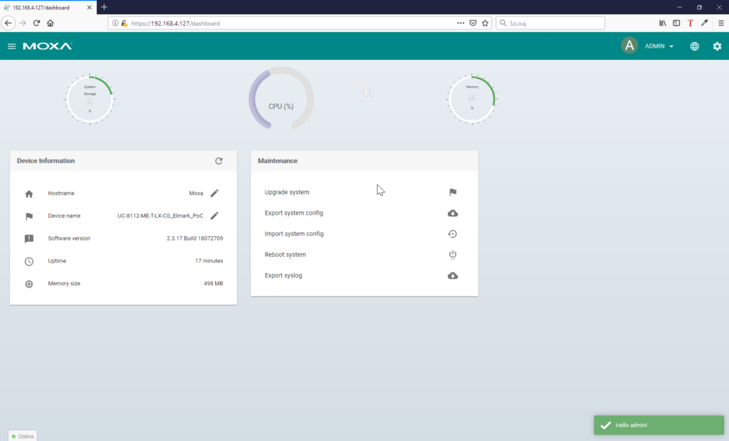 Pierwszym krokiem jest jak zawsze zalogowanie się do w interfejsu webowego, domyślny adres to 192.168.4.127, należy też pamiętać, że domyślnie konsola konfiguracyjna jest uruchomiona tylko na interfejsie LAN2, domyślnie LAN1 jest do połączenia do siecią lokalną lub WAN. Domyślny login i hasło to admin@moxa.com i admin1234. Po zalogowaniu pierwsze co zobaczymy to widok główny czyli dashboard z podstawowymi informacjami i funkcjami do zarządzania.