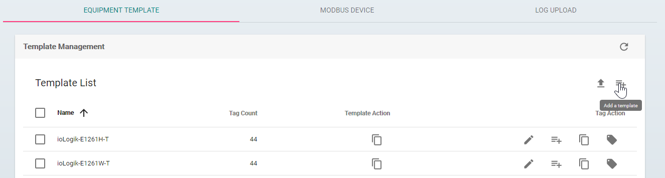 Nasz nowy szablon już powinien być na liście, następnym krokiem jest dodanie tagu, czyli szczegółów na temat odpytywanych adresów, takich jak numer funkcji Modbus, adres rejestru, typ przechowywanych danych, ilość rejestrów Modbus do odpytywania, i kolejność bajtów. Dane te można znaleźć w dokumentacji technicznej danego urządzenia.