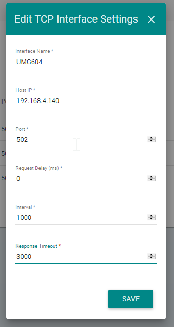 Następnie należy przejść do zakładki „Modbus Device”, i w moim przypadku zakładki „Modbus /TCP”. Klikamy „Add a TCP Interface” aby dodać nowy intefejs, tam wpisujemy nazwę, adres IP, port TCP i inne parametry, a na koniec tradycyjnie „SAVE”.