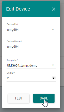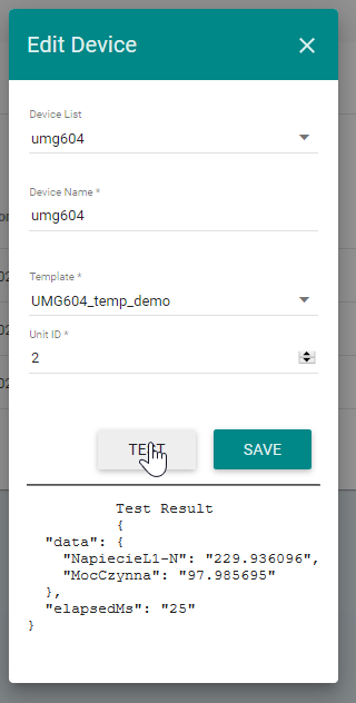 Do tak utworzonego interfejsu należy przypisać wcześniej utworzony szablon Modbus, podać ID tego slave, i zapisać. Klikając „TEST” można też sprawdzić, czy ThingsPro prawidłowo odczytuje dodane urządzenie.