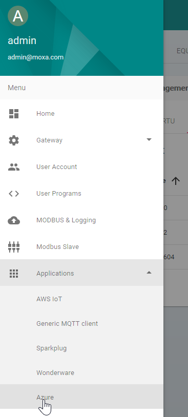 ThingsPro odczytuje już dane z podłączonych urządzeń Modbus, następnie należy skonfigurować klienta Azure IoT. W tym celu należy przejść do Menu Menu->Applications-> Azure.