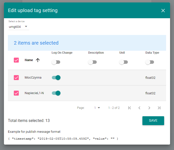Klikamy „SAVE” i dodajemy w ten sam sposób kolejne tagi, czyli odczytywane rejestry, o ile są one w tym samym urządzeniu. Do odczytywania rejestrów z innego urządzenia (slave) należy dodać kolejny szablon.
