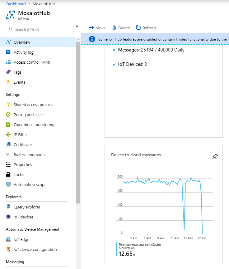 Można też zaznaczyć „Logging data when network is disconnected” aby dane były zapisywane lokalnie w razie przerwy w dostępie do Internetu, a po powrocie zostaną przesłane do chmury. Na koniec wystarczy kliknąć „SAVE”, aby dane z naszych urządzeń Modbus zaczęły w końcu spływać do Azure IoT hub. Ale jak to sprawdzić? Wystarczy w konsoli Azure przejść do wcześniej utworzonego Huba i zjechać na dół do wykresu „Device to cloud messages”. Jeśli konfiguracja jest poprawna to zobaczymy ładny wykres z ilością przesłanych wiadomości, jeśli nie to znaczy, że gdzieś popełniliśmy błąd.