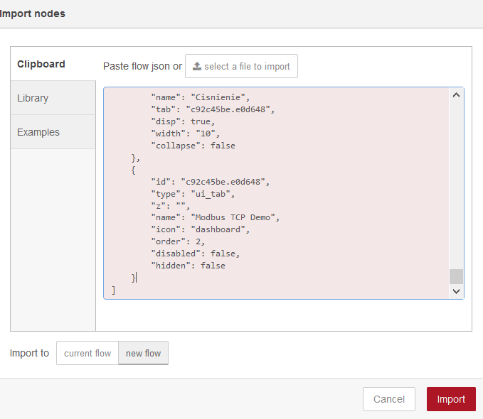 Przechodząc do zakładki Import można dodać kod programu, który wykorzystywany jest w naszym demo z Modbusem TCP.