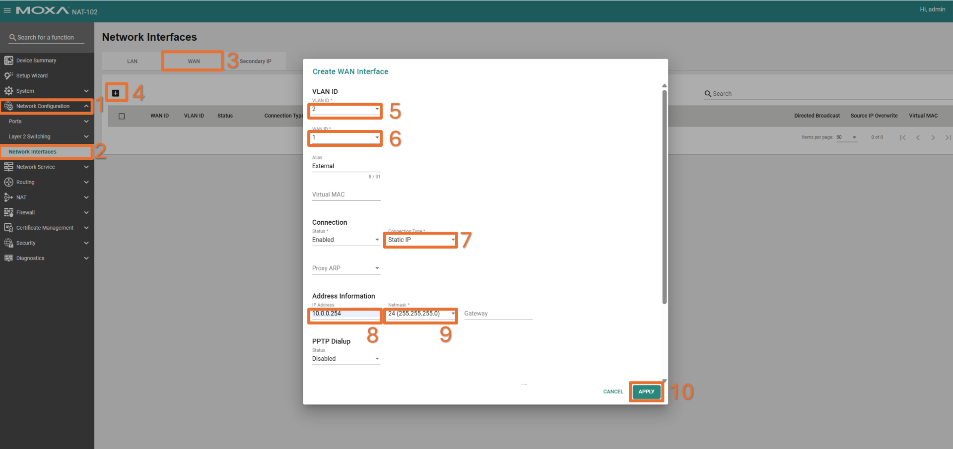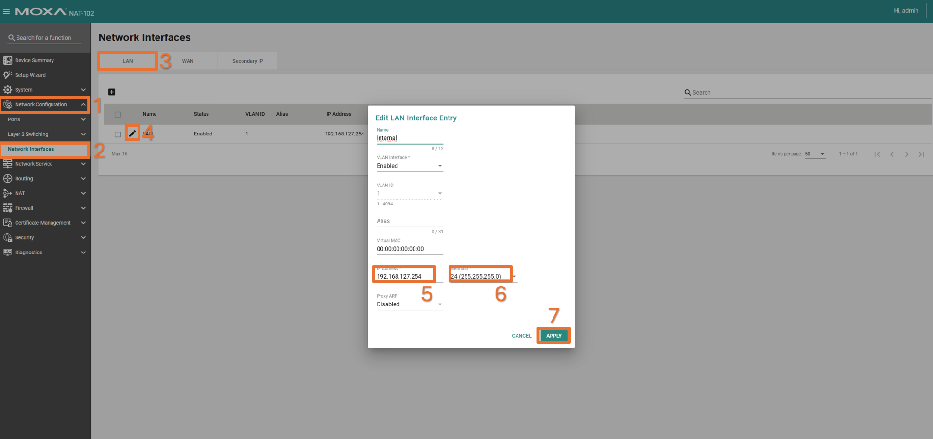 W zakładce LAN edytujemy istniejący interfejs, ustawiając nazwę, adres IP oraz maskę sieci, a następnie zapisujemy zmiany przyciskiem Apply. Po zmianie adresu IP dostęp do urządzenia będzie możliwy właśnie pod tym nowo skonfigurowanym adresem.