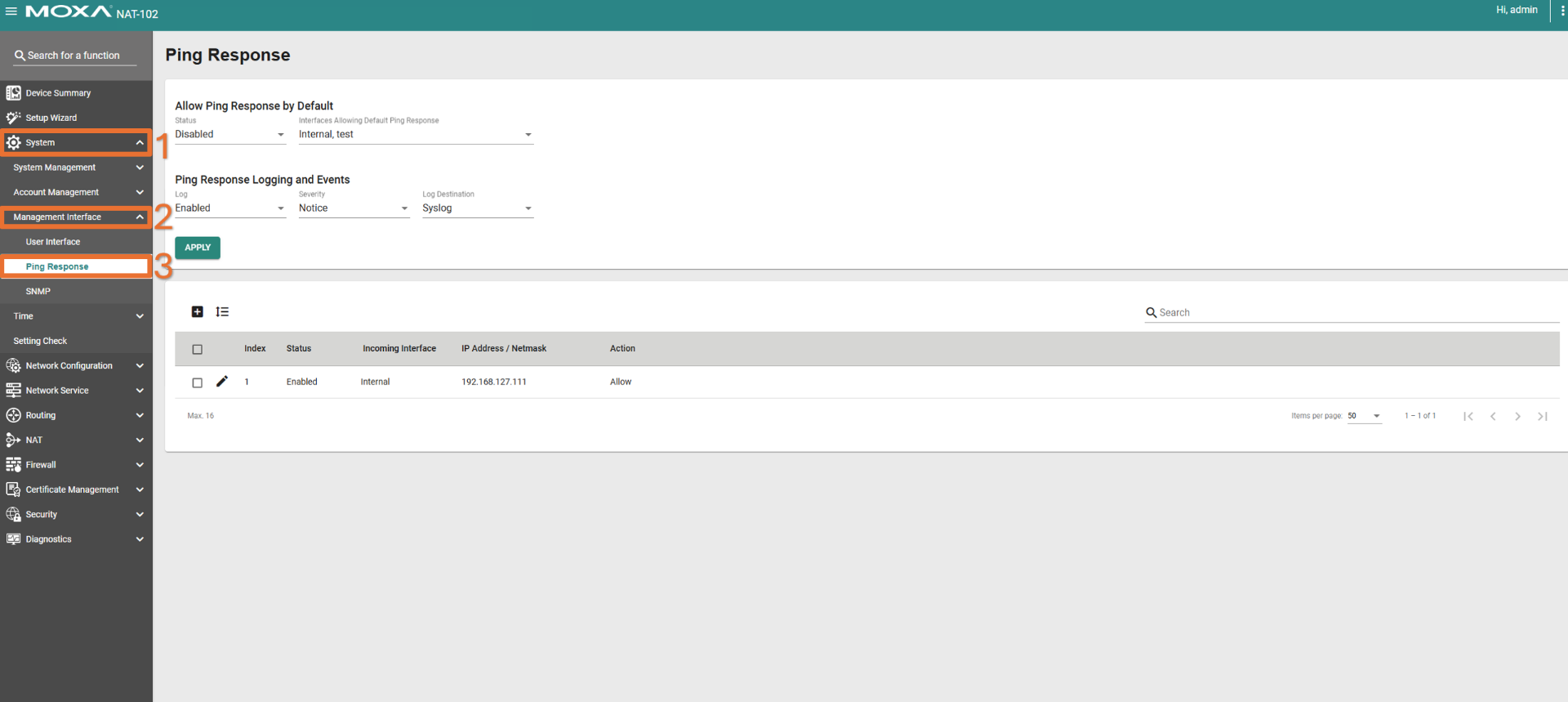 - Polityka „Allow Ping Response by Default”: Globalne ustawienie, które definiuje bazowe zachowanie urządzenia. Jeśli zostanie ustawione na Disabled, urządzenie zignoruje wszystkie zapytania ping, chyba że stworzymy dla nich wyjątek.