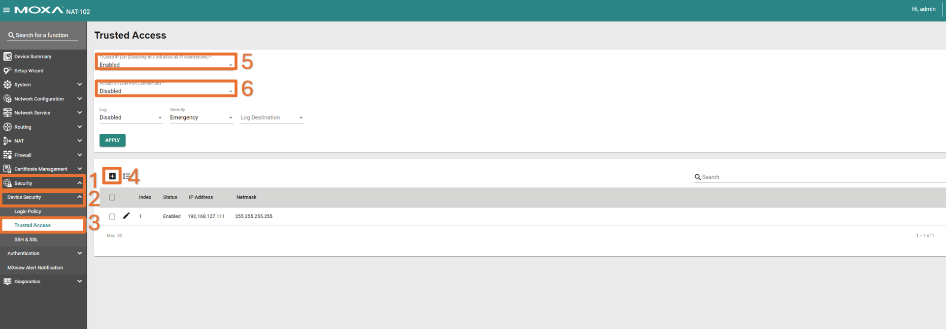 - Zasady dla sieci lokalnej: Jeśli opcja Accpet All Lan Port Connetions jest włączona, urządzenia z sieci lokalnej zachowają dostęp do panelu zarządzania nawet bez wpisywania ich na listę zaufanych hostów.
