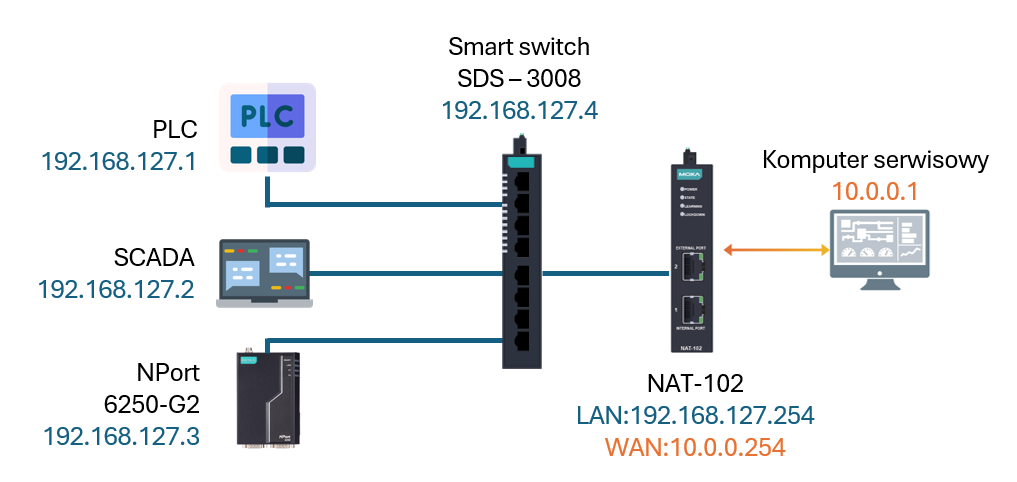 Celem naszego działania będzie umożliwienie nawiązania komunikacji z wewnętrznym, odizolowanym segmentem sieci 192.168.127.0/24. Dzięki mapowaniu 1:1 zapewnimy urządzeniom z innej sieci (w naszym przypadku 10.0.0.0/24) swobodny dostęp do zasobów pod unikalnymi adresami, co umożliwi komunikację bez ingerencji w lokalną konfigurację. Dodatkowo, po włączeniu funkcji Double NAT, ruch widziany przez urządzenia w sieci LAN będzie wyglądał jak komunikacja lokalna, dzięki czemu nie będzie konieczne modyfikowanie ich ustawień bramy domyślnej.
