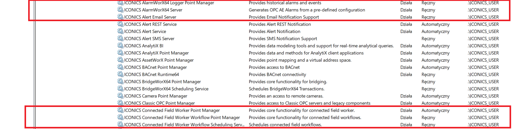 W tym przypadku należy utworzyć 4 nowe zmienne środowiskowe. Należy również pamiętać, aby utworzyć zmienne środowiskowe dla użytkownika, pod którym działają usługi oprogramowania SCADA.