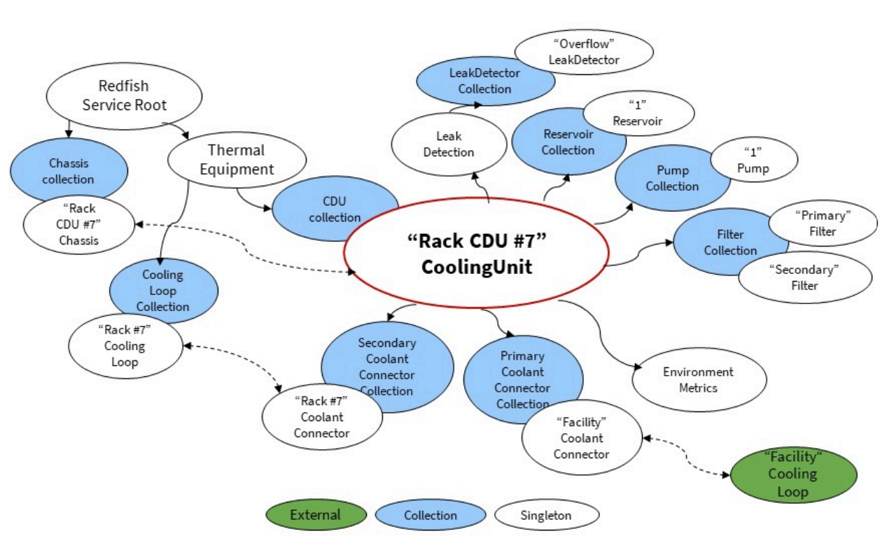 Poniżej znajduje się przykładowy diagram drzewa zasobów, zaczynający się od Redfish Service Root, zawierający wszystkie zasoby używane do modelowania jednostki dystrybucji chłodzenia opartej na szafie rack (CDU).