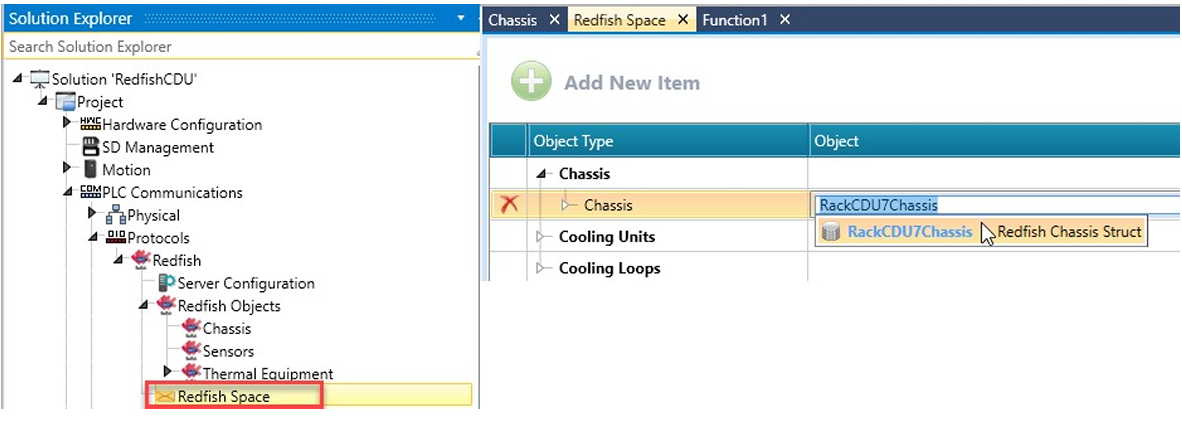 5. Wybierz Redfish Space w Solution Explorer, kliknij Chassis > Add New Chassis i połącz swoją strukturę Chassis.