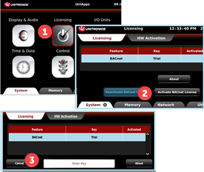 Po zakupie licencji należy na sterowniku z wgraną konfiguracją BACnet/IP uruchomić UniApps, a następnie wybrać Licensing -> Activate BACnet License -> Enter Key i na tym ekranie wprowadzić otrzymany klucz.