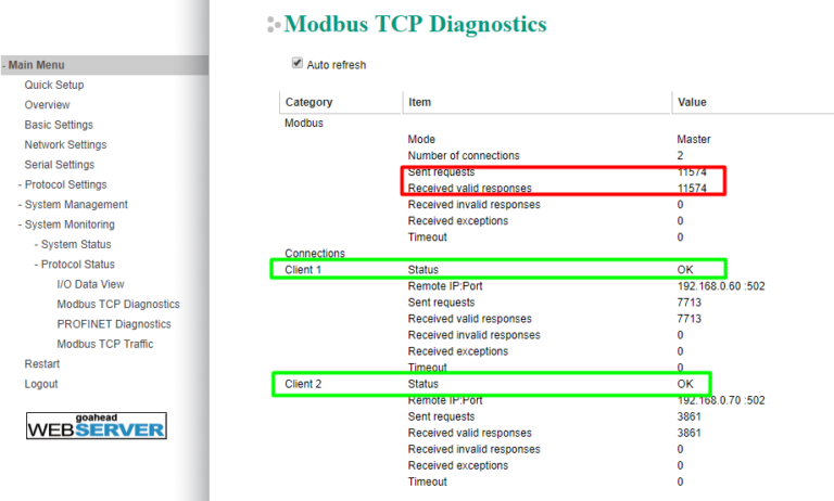 W zakładce System Monitoring -> Protocol Status -> Modbus TCP Diagnostics można odczytać status m.in. każdego podłączonego urządzenia (klienta) oraz liczbę wysłanych zapytać oraz otrzymanych odpowiedzi.