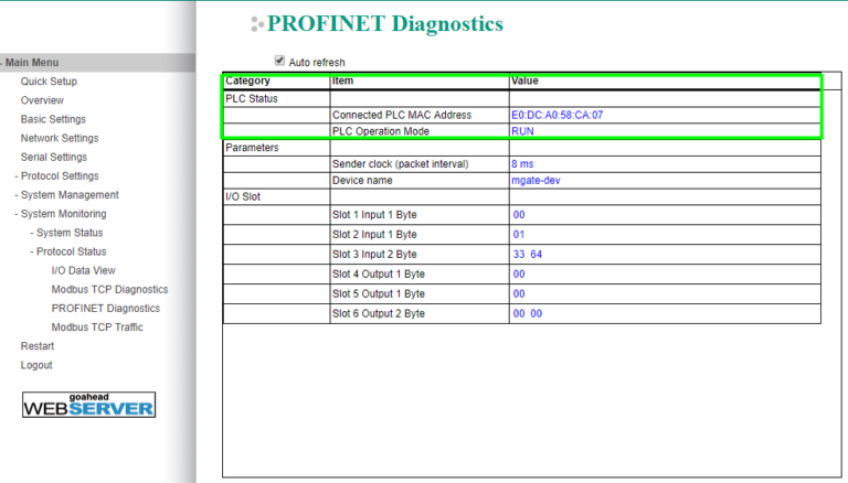 W zakładce System Monitoring -> Protocol Status -> PROFINET Diagnostics możemy sprawdzić status podłączonego Controllera Profinet, jego adres MAC, a także szczegóły związane z wymienianymi danymi Input/Output.