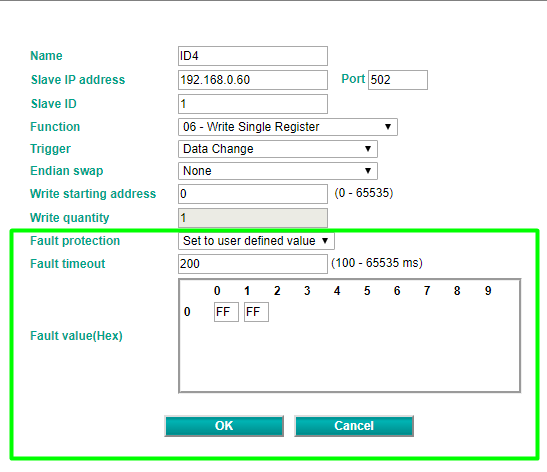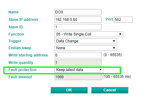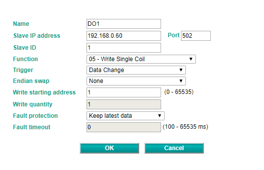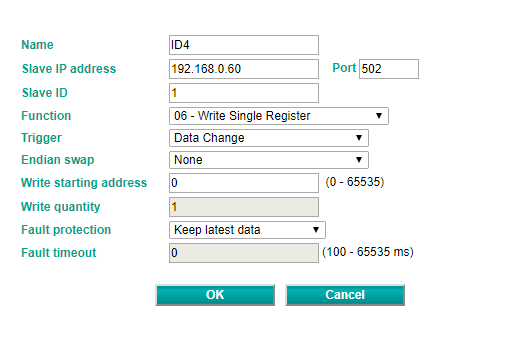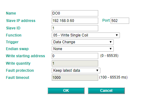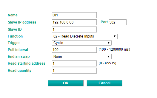 - Slave IP address: Adres IP urządzenia końcowego oraz numer portu na którym nasłuchuje Modbus TCP
