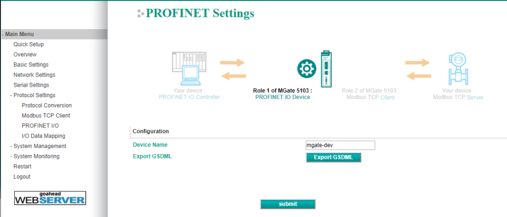 Plik GSD można pobrać ze strony producenta lub wyeksportować ze wstępnie skonfigurowanymi parametrami w zakładce Protocol Settings -> Profinet IO klikając w przycisk Export GSDML.