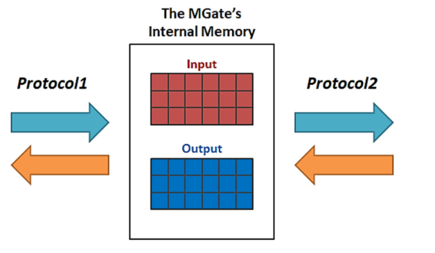 W przypadku konwersji pomiędzy różnymi protokołami, MGate pracuje w trybie Agenta i wykorzystuje swoją wewnętrzną pamięć do wymiany danych. Wewnętrzna pamięć MGate podzielona jest na dwie części - input oraz output.
