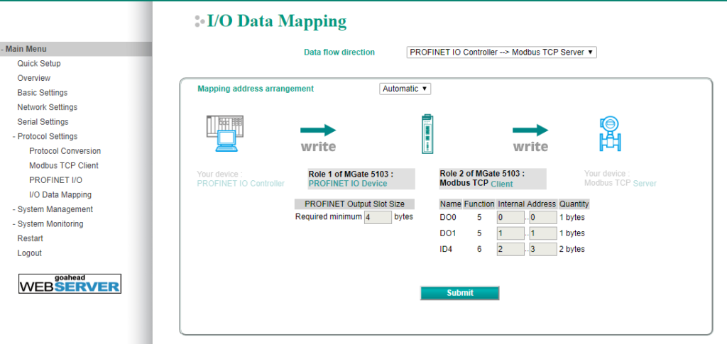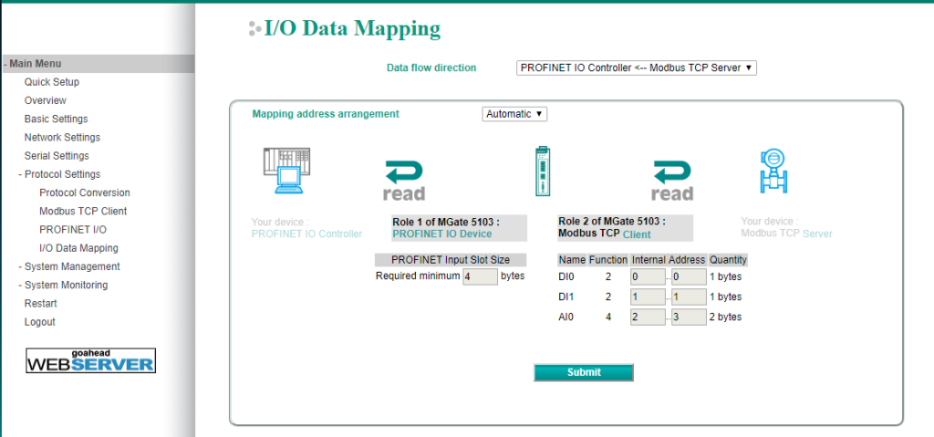 Wykorzystując opcję I/O Data Mapping możemy ręcznie wybrać rejestry w wewnętrznej pamięci MGate, w których będą zapisywane dane. Można również wybrać opcję automatyczną, która będzie zapisywać dane w pierwszych wolnych rejestrach w pamięci wewnętrznej.