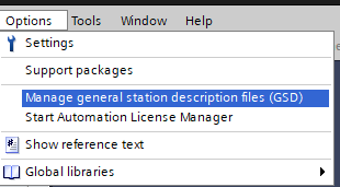 Aby zaimportować w projekcie plik GSD należy przejść do zakładki Options a następnie Manage general station description files (GSD)