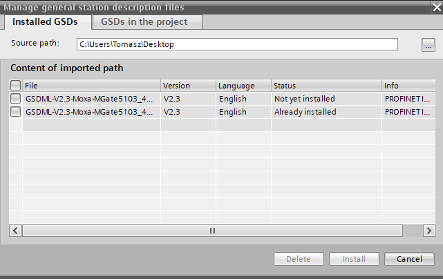 Aby umożliwić projektowanie systemu, wymagany jest do konfiguracji plik GSD (General Station Description) danego urządzenia polowego. Plik GSDML w formacie XML opisuje właściwości i funkcje stacji polowej