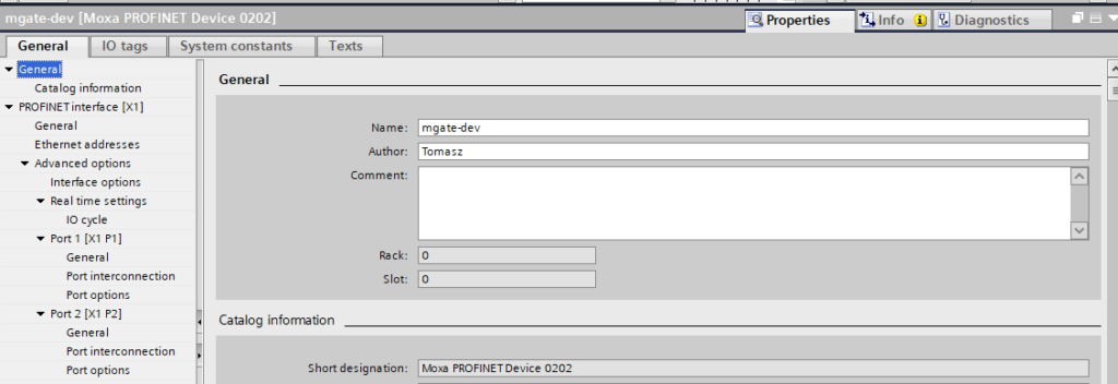 Kolejnym krokiem jest dodanie urządzenia do projektu. W tym najwygodniej w zakładce Hardware catalog wyszukać "moxa" i wybrać Moxa PROFINET Device 0202. Ikonkę należy przeciągnąć i dopisać do odpowiedniego interfejsu PN/IE.