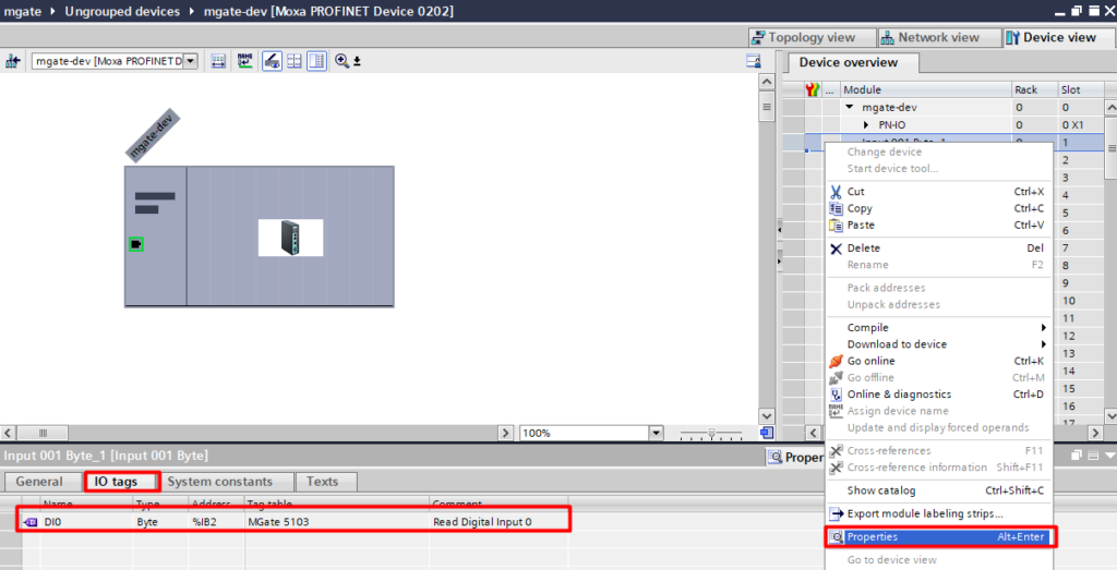 Odczyt sygnałów w TIA Portal poprzez wgranie modułów Input oraz Output. W tym celu w zakładce Device view dla MGate 5103.