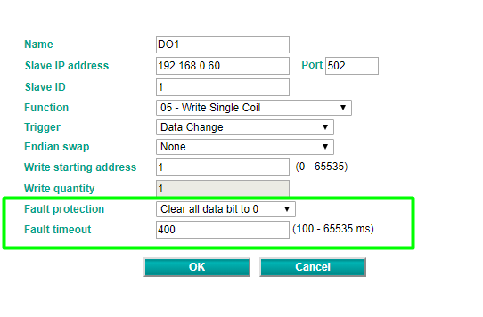 W przypadku utraty komunikacji z układem sterujący, MGate cały czas wysyła zapytania, ale nie otrzymuje odpowiedzi. Nie zawsze takie zachowanie jest pożądane. Ze względów bezpieczeństwa, w przypadku utraty komunikacji, np. ze sterownikiem bezpieczeństwa, można skonfigurować "bezpieczne" zapytania, które zostaną wysłane.