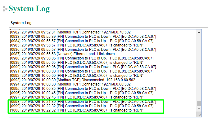 Po powrocie komunikacji ze sterownikiem PLC, status urządzeń wraca do normy, a zaistniała sytuacja zostaje odnotowana w logach.