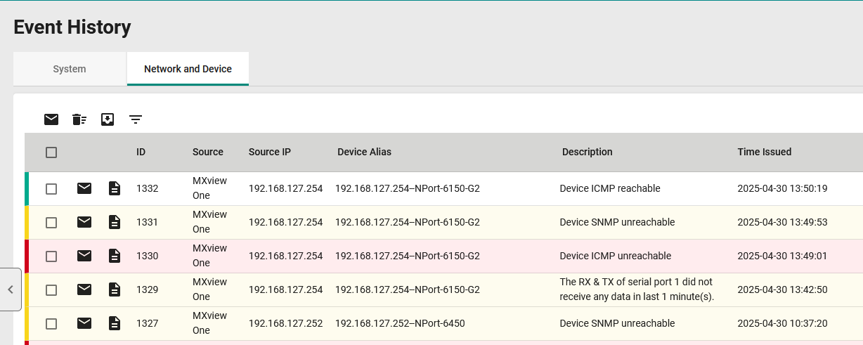 Event Log – w tym widoku zgromadzone są wpisy dotyczące sieci przemysłowej. Logi mogą być oczywiście filtrowane. Jeżeli oprogramowanie MxView One pracuje jako serwer Syslog wówczas w tym widoku widoczne są logi wysyłane do serwera Syslog przez urządzenia pracujące w sieci przemysłowej (oczywiście konieczna jest prawidłowa konfiguracja urządzeń w tym zakresie)
