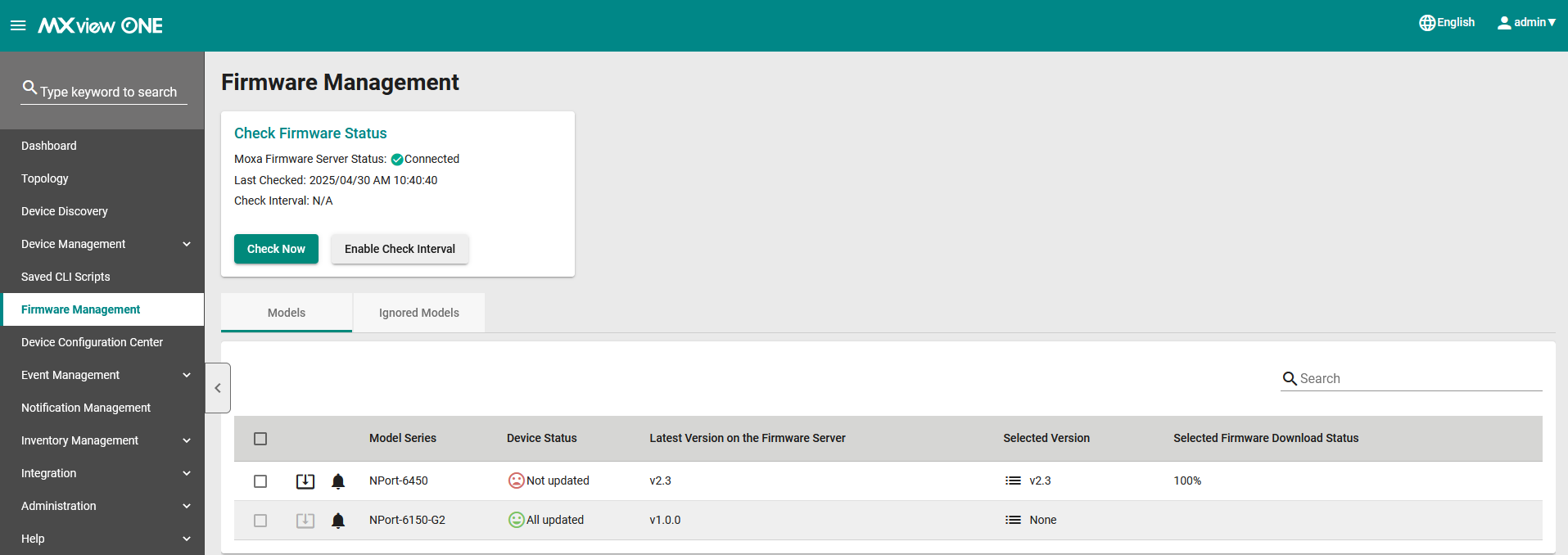 Firmware Management – funkcjonalność pozwalająca na sprawdzanie wersji firmware urządzeń pracujących w sieci przemysłowej. Jeżeli oprogramowanie MxView One jest zainstalowane na komputerze lub serwerze z dostępem do Internetu możemy dodatkowo z tego poziomu wykonać aktualizację oprogramowanie firmware w urządzeniach. Warto zaznaczyć, że w takim przypadku aktualizacja może być przeprowadzona dla wieli urządzeń w sposób zautomatyzowany, bez potrzeby logowania się na poszczególnych urządzeniach.