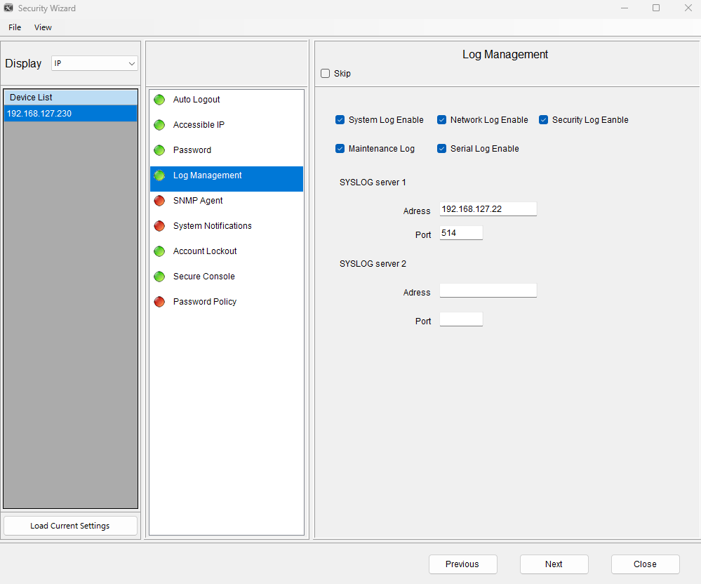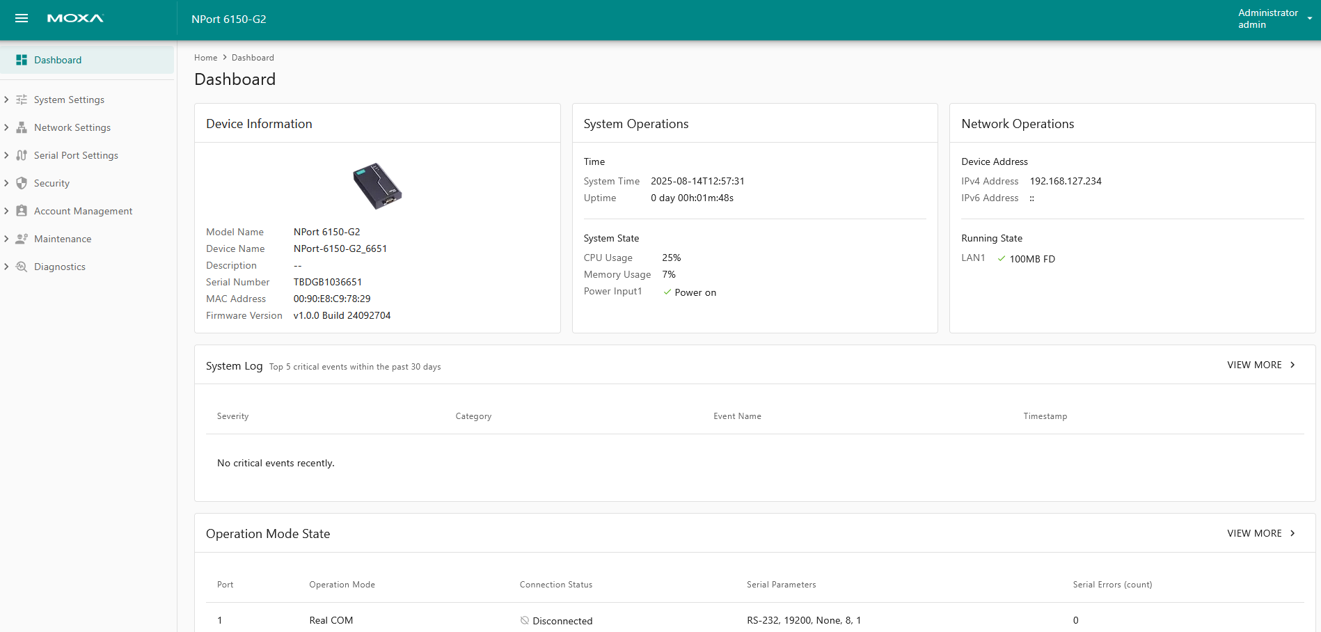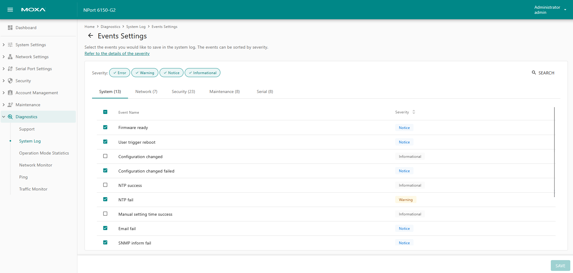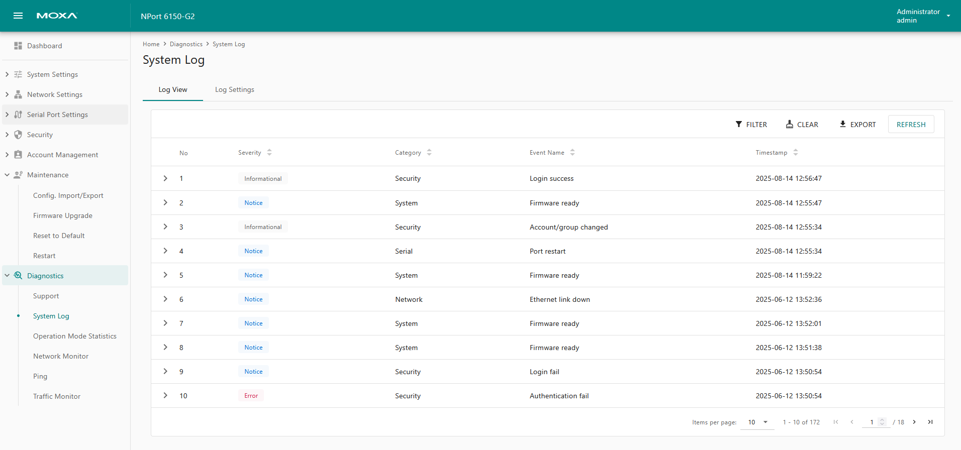 Moxa poprawił również możliwości diagnostyczne. Już po zalogowaniu użytkownik widzi dahsboard na którym zgromadzone są wszystkie najważniejsze informacje podsumowujące stan pracy urządzenia. Znajdziemy tutaj informacje na temat stanu pracy samego urządzenia (model, wersja firmwre, numer seryjny itp), wykorzystanie zasobów systemowych (pamięć, CPU), czas pracy, ostatnie wpisy z logu urządzenia oraz podsumowanie dotyczące pracy poszczególnych portów szeregowych. Znacznie bardziej rozbudowane są również możliwości związane z logowaniem zdarzeń dotyczących pracy urządzenia. Użytkownik może wybrać, które zdarzenia mają być logowane i w jaki sposób. Do wyboru jest kilkadziesiąt różnych zdarzeń podzialonych na 6 grup: System, Network, Security, Maintenance oraz Serial . Logi mogą być zbierane w wewnętrznej pamięci urządzenia lub na maksymalnie dwóch serwerach SYSLOG.