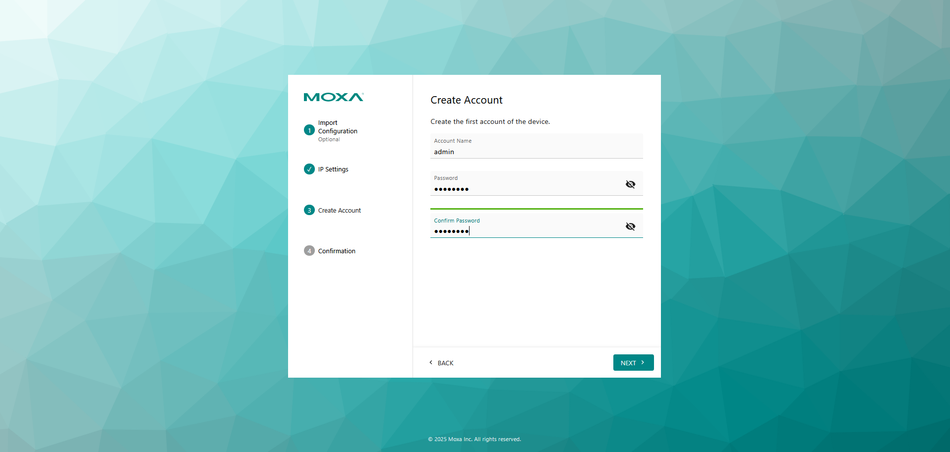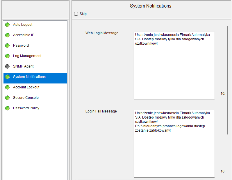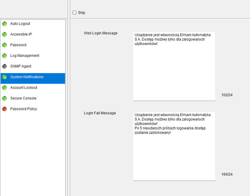 - konieczność utworzenia użytkownika i hasła - zgodnie z IEC 62443-4-2 nie ma domyślnych parametrów logowania, użytkownik tworzy konto w czasie pierwszego uruchomienia