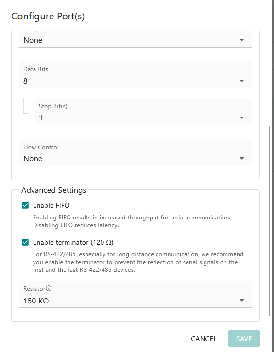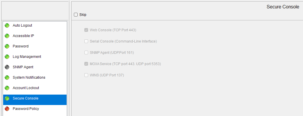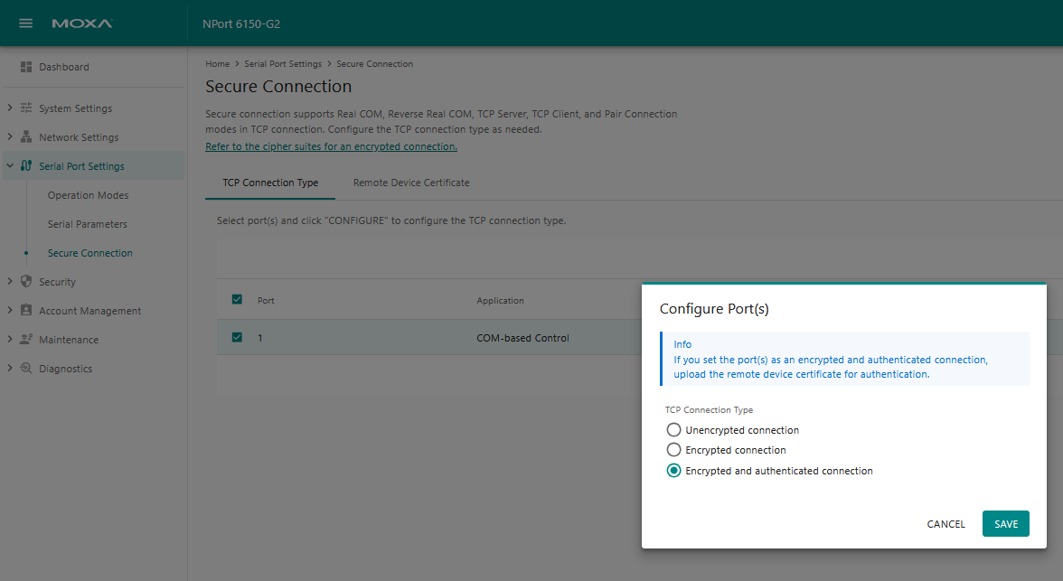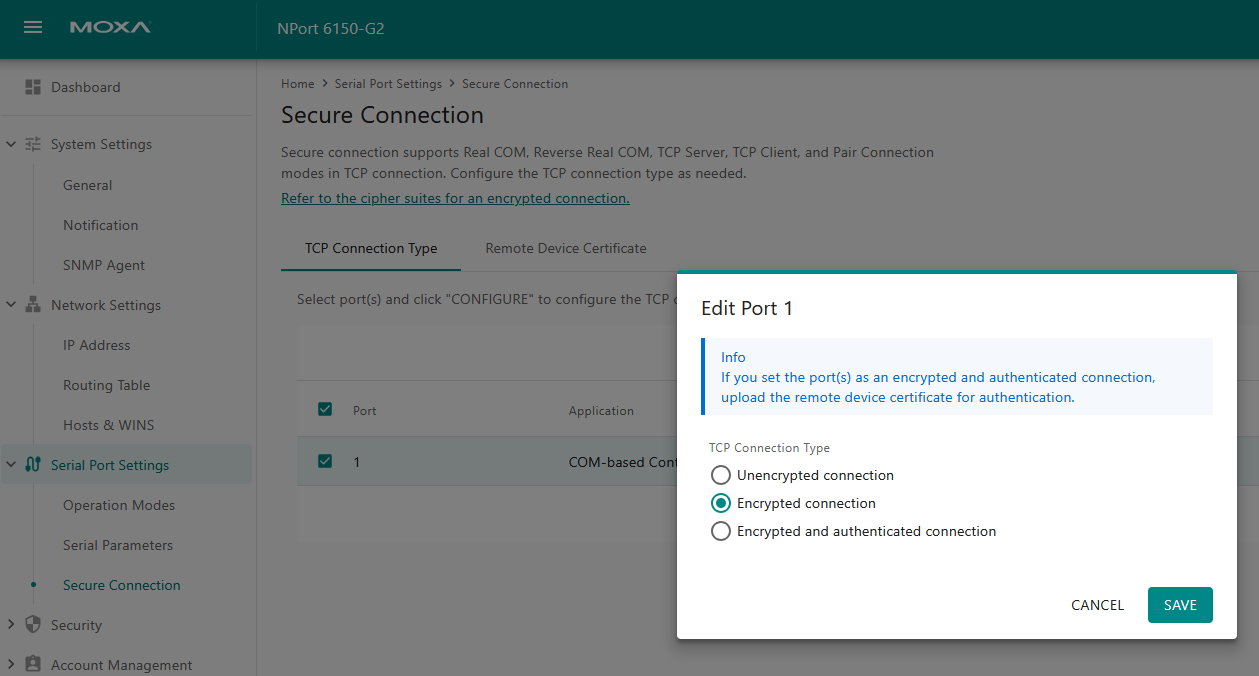 1. Przejść do ustawień portu szeregowego w konsoli internetowej (Web Console): Serial Port Settings > Secure Connection