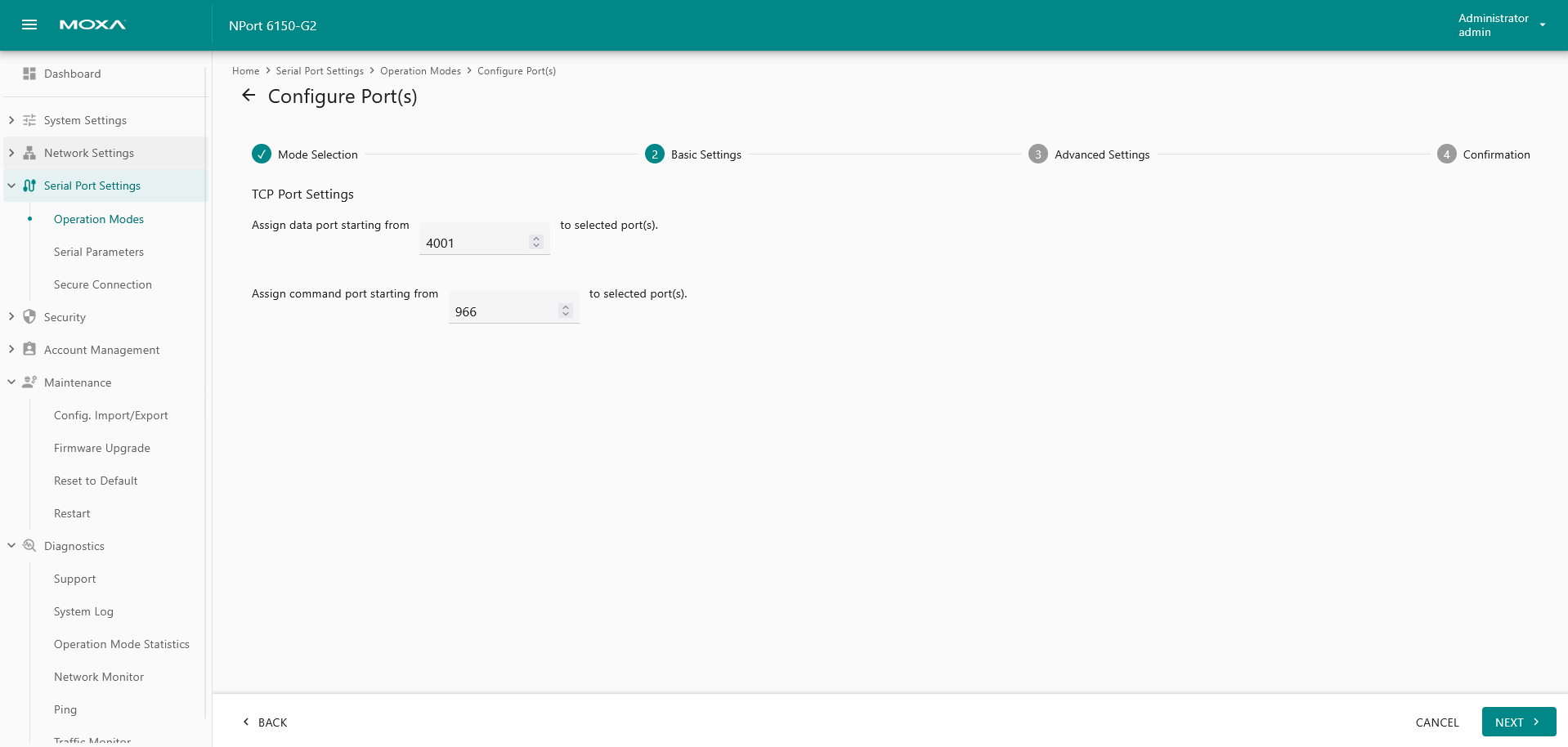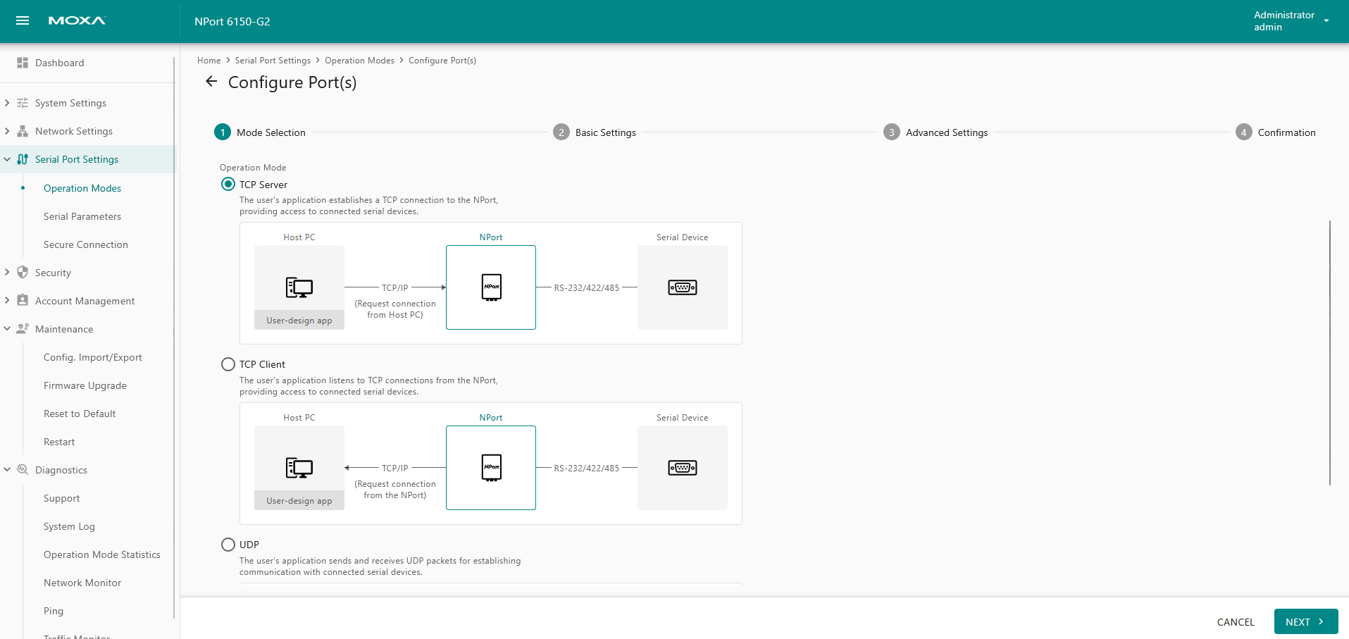 Kolejnym isotnym udogodnieniem jest dużo łatwiejsza konfiguracja trybów pracy. Cały proces został podzielony na cztery kroki. W pierwszym kroku wybieramy rodzaj aplikacji oraz konkretny tryb pracy. Każdy tryb pracy zilustrowany jest schematem blokowym, co znacznie ułatwia wybór. W kolejnym kroku należy wybrać podstawowe ustawienia dla wybranego trybu pracy. W trzecim kroku podejemy ustawienia opcjonalne. W dotychczasowych modelach NPortów wszystkie ustawienia związane z trybem pracy były dostępne w jednej zakładce. Mniej doświadczeni użytkownicy często nie widzieli, które parametry powinni skonfigurować, a które są opcjonalne.