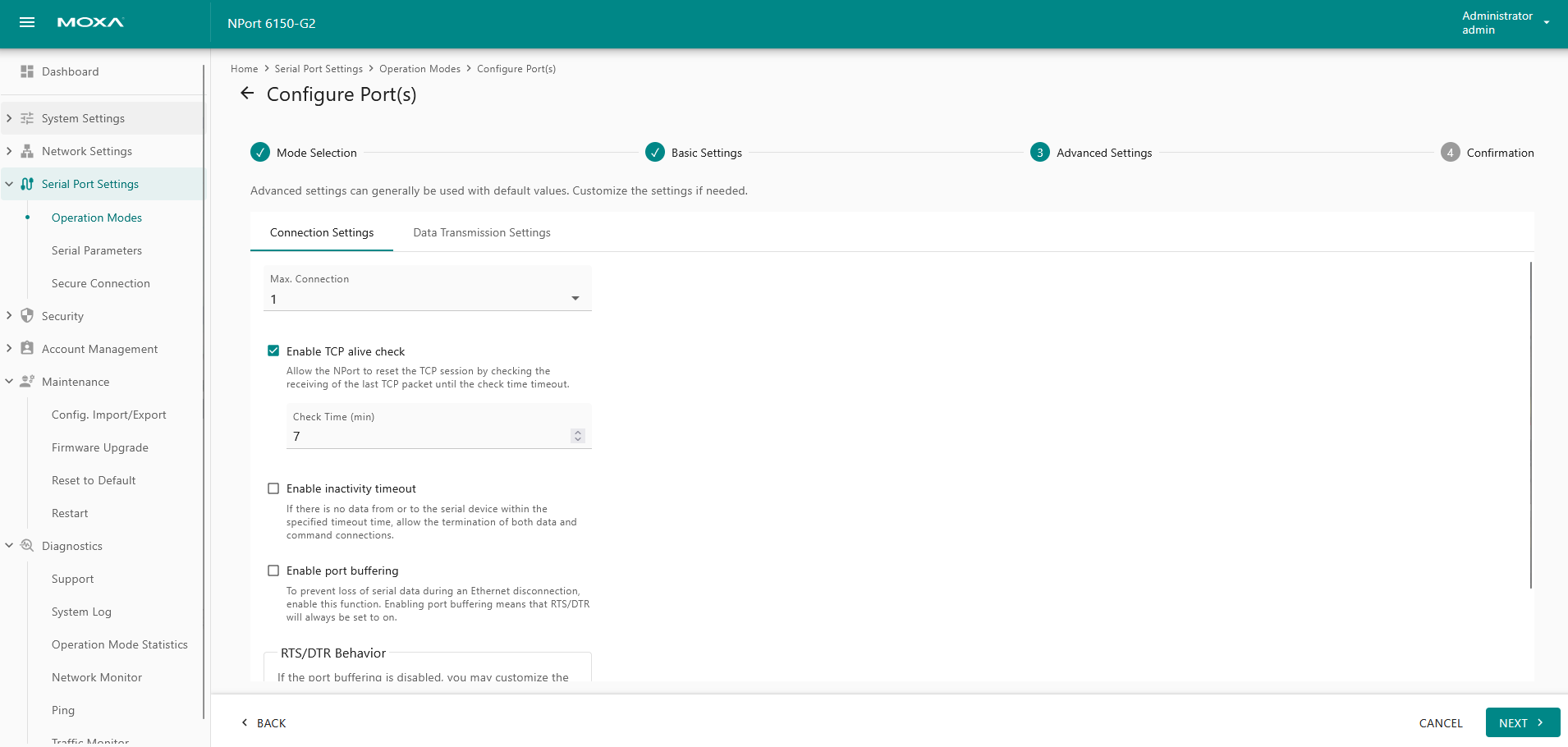 2. Wybrać opcję TCP Connection Type dla każdego portu szeregowego.