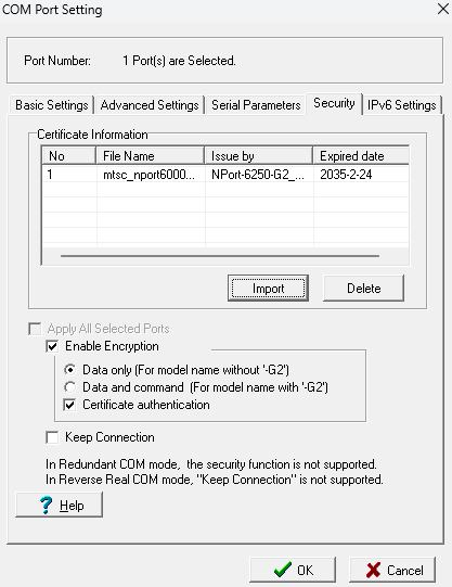 Drugim istotnym obszarem cyberbezpieczeństwa jest możliwość szyfrowanie transmisji w wartswie Ethernet. W porównaniu do serii NPort 6000 poprzedniej generacji wprowadzono możliwość uwierzetelniania uczestników komunikacji (NPort 6000-G2 oraz aplikacja na kompuerze PC) za pomocą certyfikatu oraz wsparcie dla silniejszych algorytmów szyfrowania.