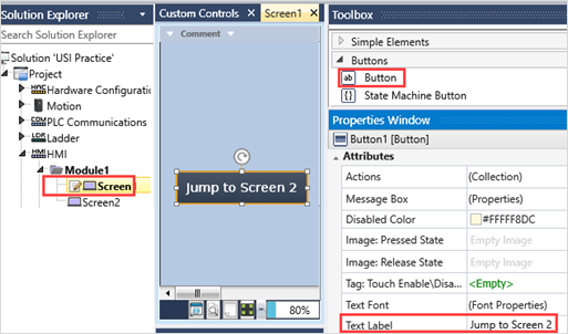 - W oknie Właściwości kliknij pole tekstowe Etykieta i wpisz „ Jump to Screen 2”.