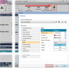 Wybierz opcję Motywy na karcie HMI, aby zdefiniować wygląd elementów wyświetlanych na ekranach HMI. Po dostosowaniu wyglądu elementów kliknij przycisk Ustaw jako aktywne, aby zastosować motyw do przyszłych elementów.