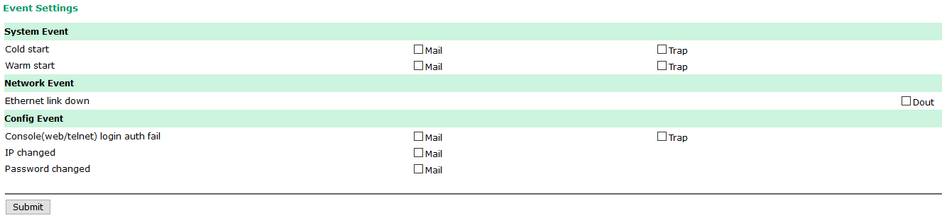 Automatyczne powiadamianie o zdarzeniach: Log, Monitoring and Warning -> Auto Warning Settings -> Event Settings