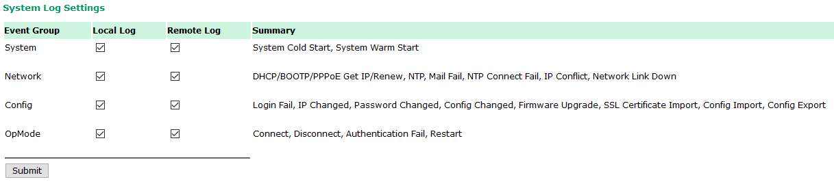 Logi mogą być zbierane lokalnie w urządzeniu lub wysyłane do serwera Syslog.