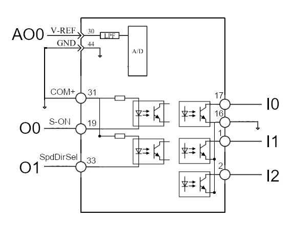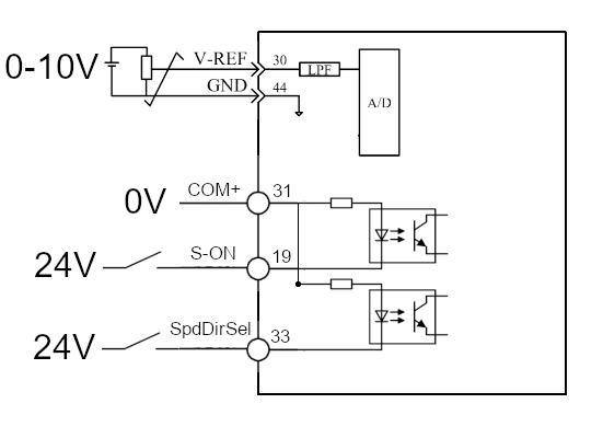 Analogicznie jak we wcześniejszych przykładach będziemy potrzebować sygnału S-ON (1) żeby zezwolić na ruch serwonapędu. Poza tym w podstawowym sterowaniu prędkością wystarczy źródło sygnału analogowego, który może stanowić potencjometr albo wyjście analogowe w PLC. Chociaż warto też dodać wejście SpdDirSel (26), które pozwoli za pomocą przełącznika lub wejścia cyfrowego zmieniać kierunek obrotów.