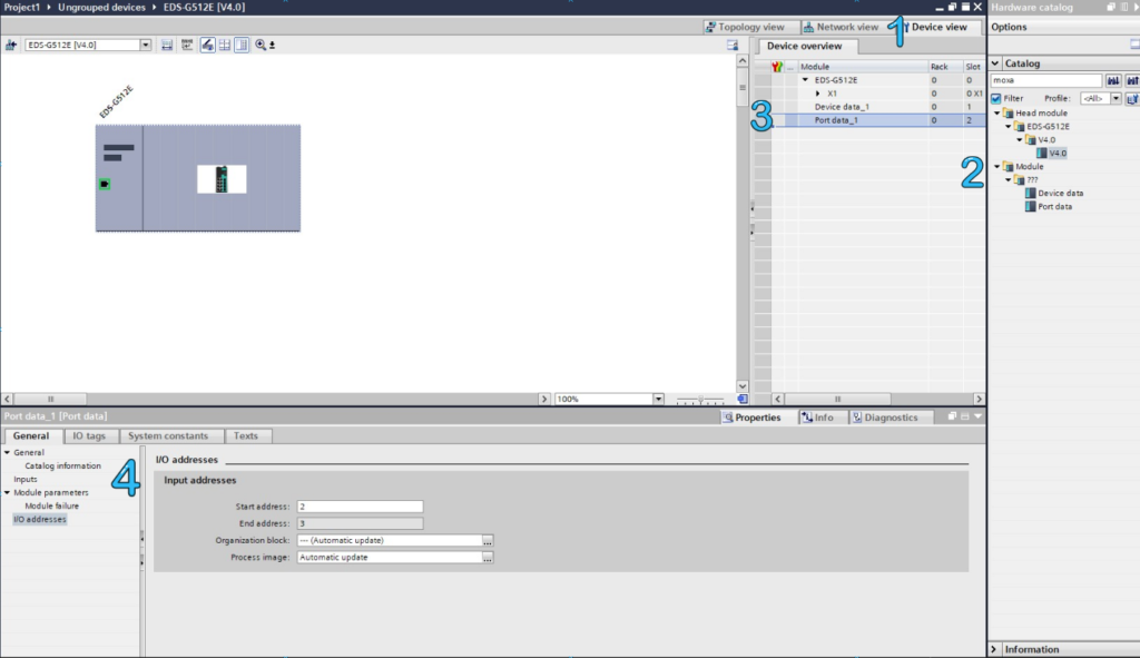 Aby dodać switche Moxa do projektu, najwygodniej przejść do zakładki Devices & networks, a następnie wybrać Network view. Naszym oczom powinno ukazać się poniższe okno. Aby dodać switch Moxa należy skorzystać z katalogu wspieranych urządzeń - Hardware catalog. Najwygodniej po prostu wpisać w wyszukiwarkę nazwę switcha, lub słowo moxa (1). W kolejnym kroku należy przeciągnąć ikonkę (2) w pole Network view (3) oraz przypisać urządzenie do odpowiedniego interfejsu PN/IE (4) - (PN= PROFINET, IE= Industrial Ethernet).