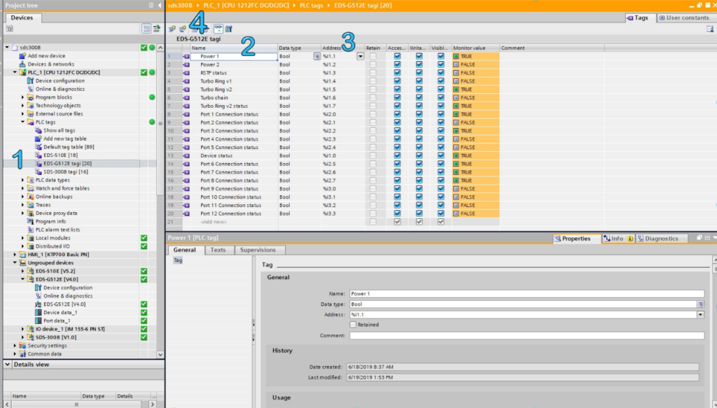 W programie TIA Portal wszystkie zmienne mogą być monitorowane grupowo w zakładce PLC tags (1). W polu Name (2) należy wpisać nazwę zmiennej, a polu Address (3) po prostu adres tagu. Klikając przycisk Monitor all (4) można na bieżąco monitorować status wszystkich zmiennych. Zgodnie z poniższym rysunkiem, widzimy iż urządzenie działa poprawnie (Device status), uaktywniony został protokół redundantny Turbo Ring v2, którego status jest poprawny. Status Turbo Ring v2 zmienni się na "False" jeżeli nastąpi awaria linii głównej.
