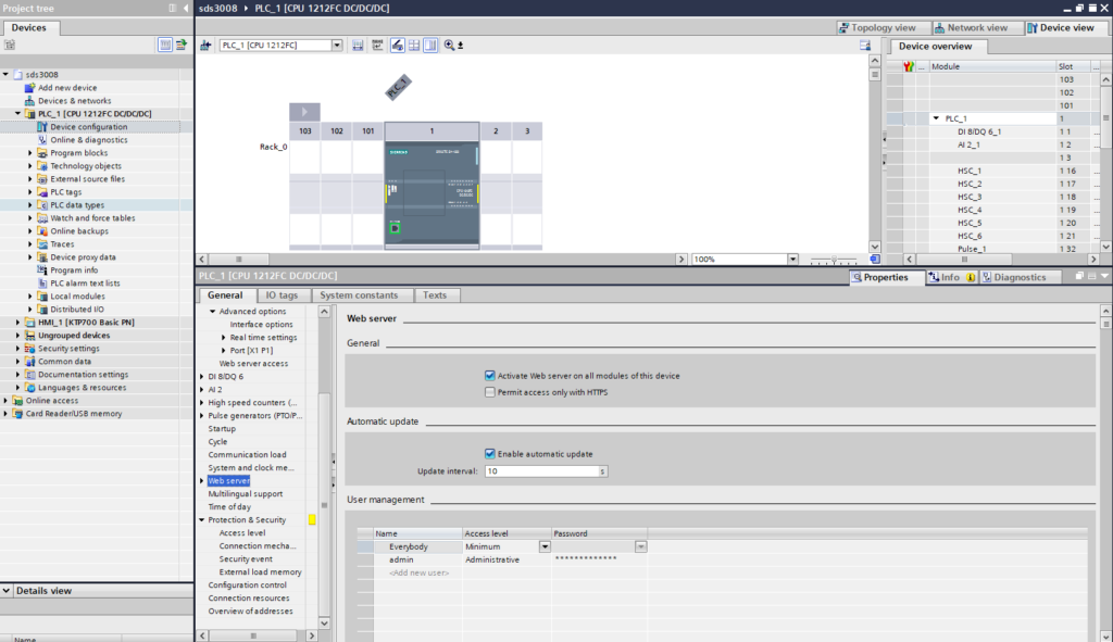 Web server można uaktywnić na sterowniku PLC w zakładce General -> Web server gdzie można definiować konta użytkowników razem z uprawnieniami.