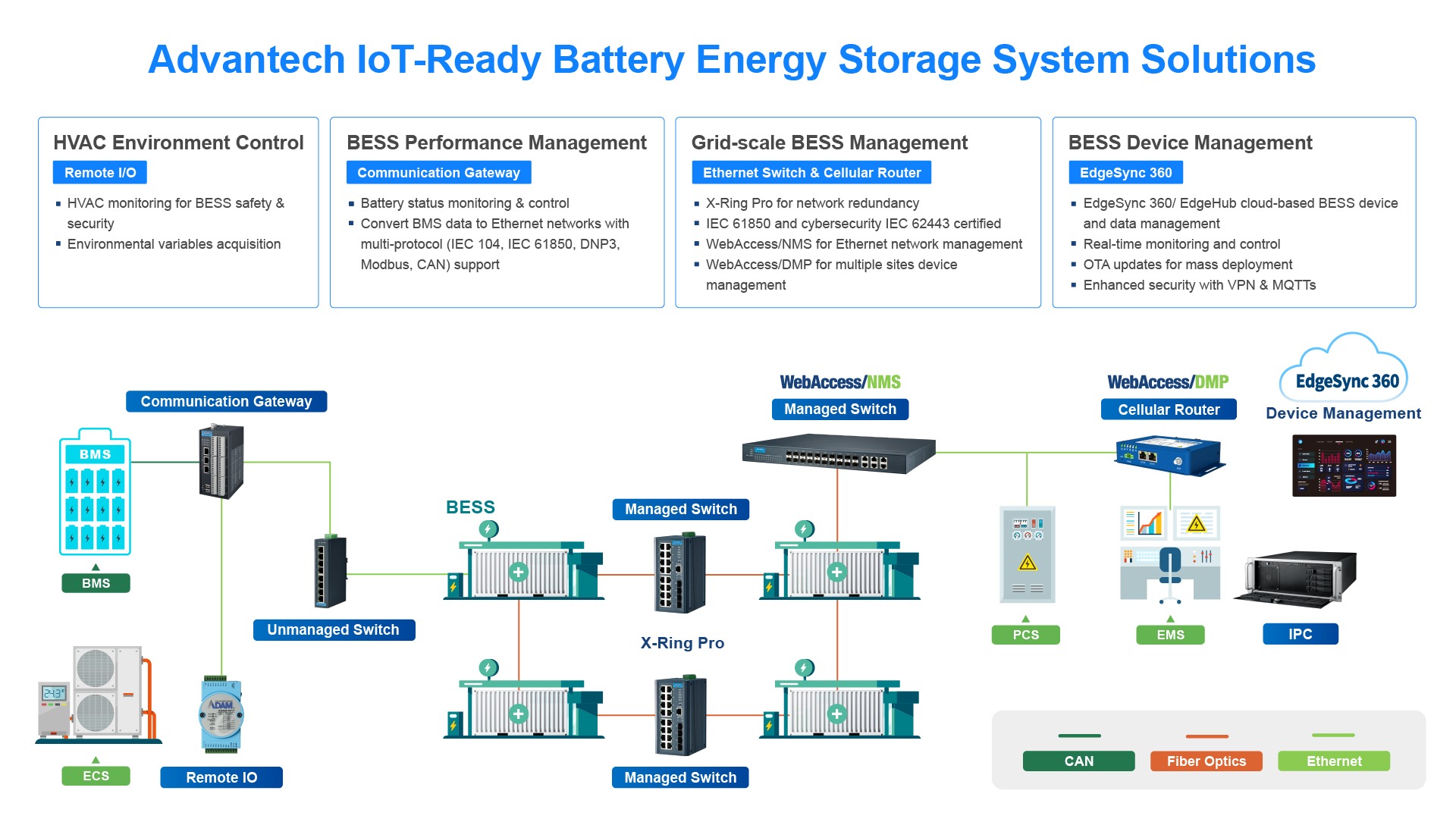 Zastosowanie technologii Industrial IoT umożliwia także zdalne monitorowanie i zarządzanie rozproszonymi instalacjami magazynowania energii. Aby zapewnić niezawodną komunikację pomiędzy urządzeniami, stosuje się przemysłowe przełączniki sieciowe, takie jak Advantech EKI-7710 czy EKI-5528I-EI, które są przystosowane do pracy w trudnych warunkach środowiskowych typowych dla infrastruktury energetycznej. Urządzenia te umożliwiają budowę niezawodnych sieci przemysłowych oraz zapewniają redundancję i bezpieczeństwo komunikacji.